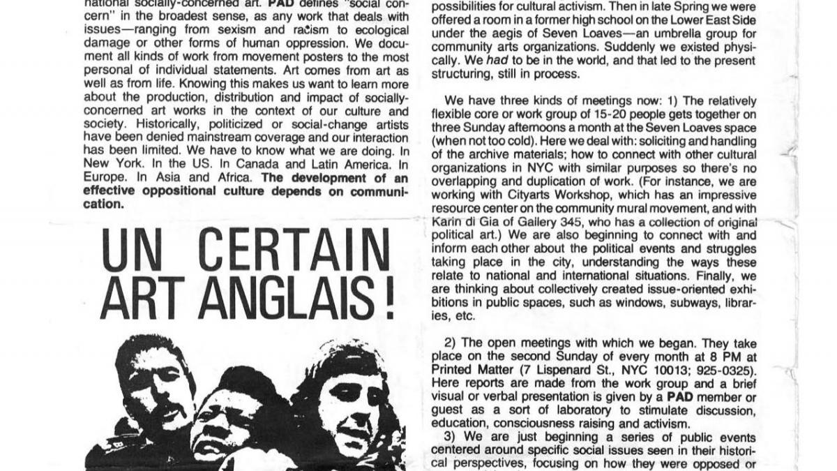 El Political Art Documentation and Distribution (PAD/D) publicó su primer boletín en febrero de 1981 bajo el nombre de 1st Issue que más tarde, en diciembre de ese año, cambió por Upfront. Siguiendo la tradición de la prensa alternativa y de otros colectivos —por ejemplo, la Art Workers’ Coalition (AWC) o las Women Artists in Revolution (W.A.R.)—, las publicaciones del PAD/D pueden consultarse online.