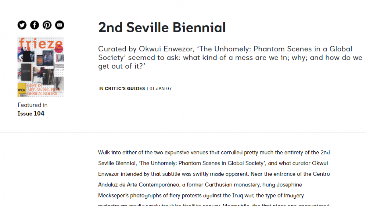 Publicada en la influyente revista de arte Frieze, esta reseña de Martin Herbert sobre las obras expuestas en la segunda Bienal Internacional de Arte Contemporáneo de Sevilla (BIACS 2; 26 de octubre, 2006-15 de enero, 2007) analiza también las implicaciones éticas del “bienalismo”.