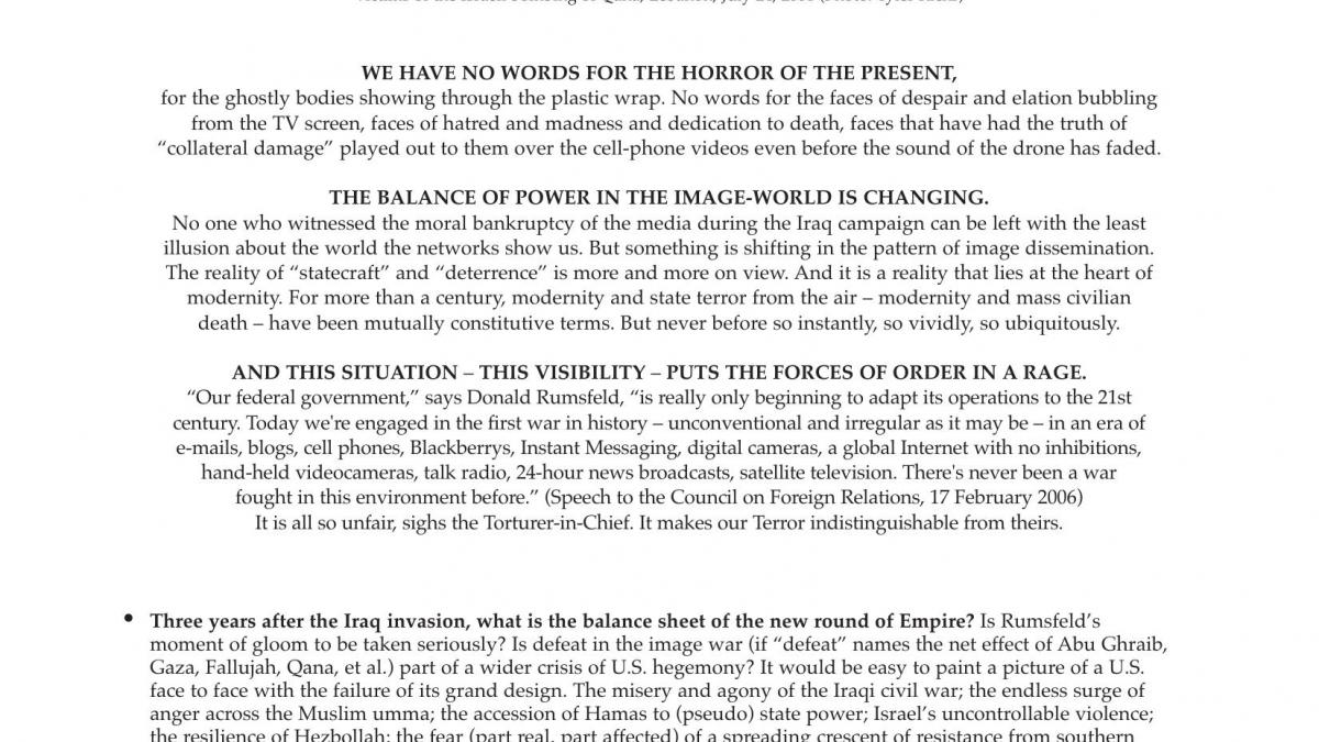 Este escrito, realizado por el grupo de artistas y escritores Retort para su distribución durante las manifestaciones de 2006 contra la guerra de Irak, comienza con una fotografía de Tyler Hicks en la que aparecen niños envueltos en plásticos asesinados en el bombardeo israelí de Qana (Líbano), denunciado por The New York Times el 31 de julio de 2006. Copias de este folleto fueron incluidas en la instalación Afflicted Powers [Poderes afligidos, 2006] que el mencionado grupo realizó en la segunda Bienal de Arte Contemporáneo de Sevilla (BIACS 2, 26 de octubre, 2006-15 de enero, 2007).