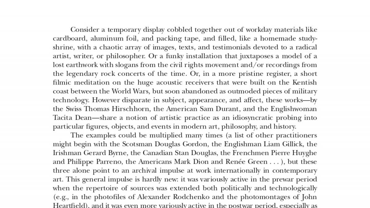 La exploración de Hal Foster sobre las implicaciones del archivo para los artistas contemporáneos se publicó en la revista estadounidense October, un medio que ha sido criticado por sus propias compulsiones culturales impulsadas a través de su línea editorial y que pueden resumirse en un derridiano “mal de archivo”: una colección sistemática de documentos y artículos sobre una comunidad-circunscripción que sostiene una lectura particular del arte y la teoría del siglo XX, y un proceso específico de selección, categorización y descripción que responde a una tendencia totalizadora y compulsiva que refuerza dicha lectura. A este respecto, la revista podría haber respondido, empleando los términos del filósofo francés Michel Foucault en su La arqueología del saber (1969), que el archivo “es ante todo la ley de lo que puede ser dicho, el sistema que rige la aparición de los enunciados como acontecimientos singulares”.