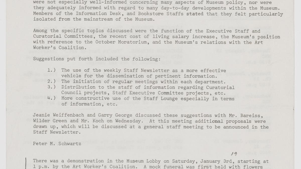 Comunicado de prensa y resúmenes de Peter M. Schwartz sobre las mejoras en las comunicaciones del museo y la Coalición de Trabajadores del Arte frente al Guernica.