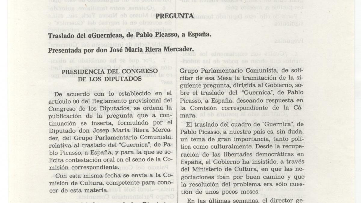 Pregunta de Josep Maria Riera Mercader sobre el traslado de Guernica a España.
