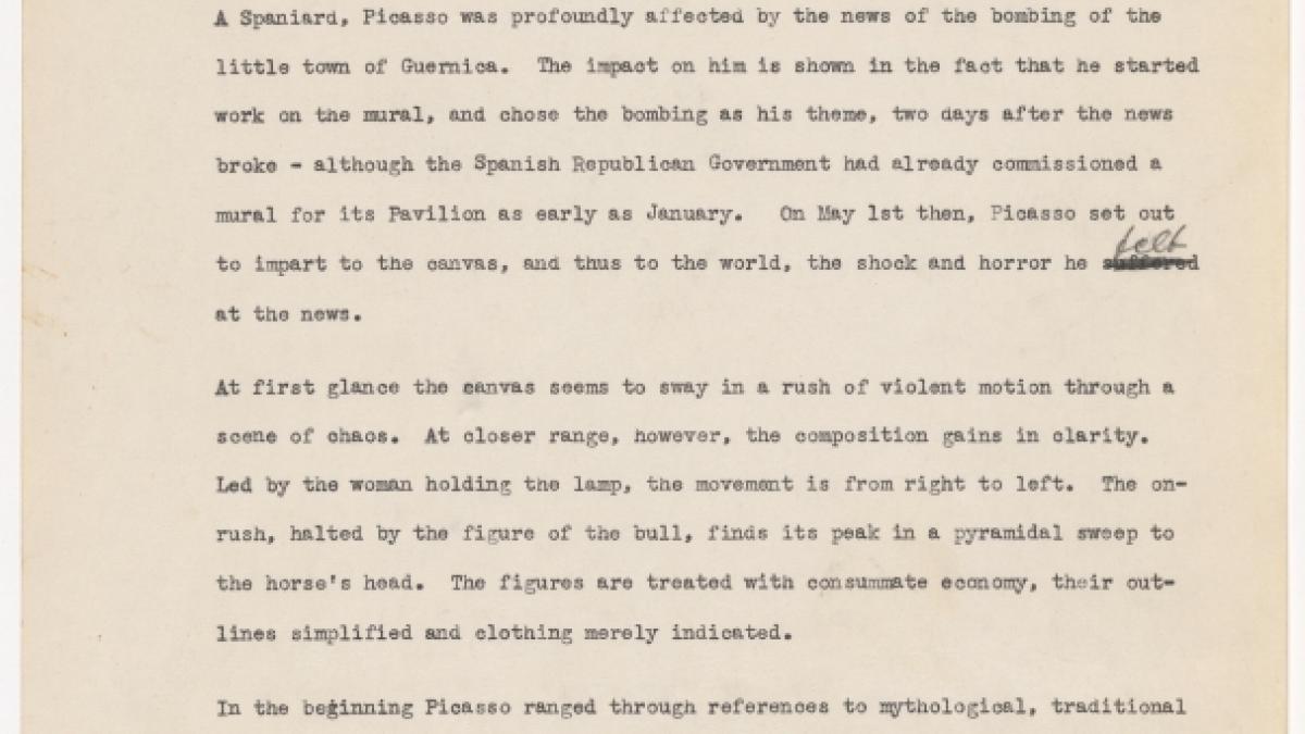 Borrador de cartela para la exposición Studies for Guernica organizada por el Museum of Art de Nueva York