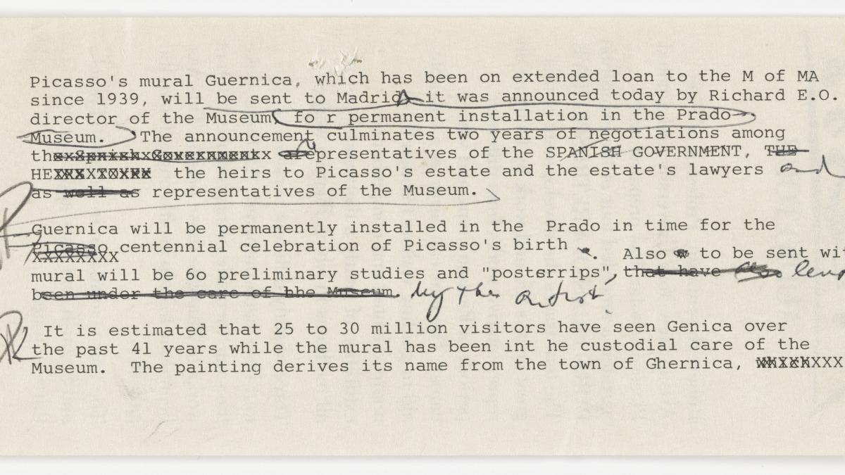 La nota explica que, de acuerdo con las declaraciones de Richard E.Oldenburg, director del Museum of Modern Art de Nueva York, Guernica y las obras a él asociado, en depósito en dicho museo desde 1939, será trasladado a Madrid para su defintiva instalación en el Museo del Prado, tras dos años de negociaciones.