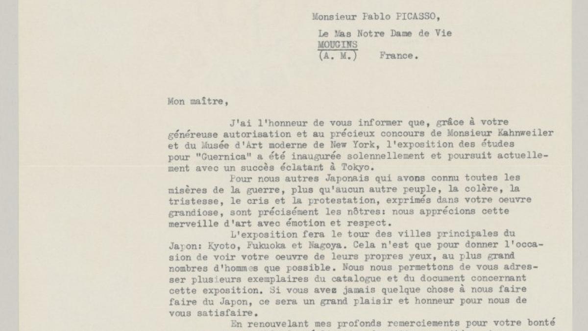 Akira Jin, presidente de la Art Friend Association de Tokio, escribe a Pablo Picasso para comunicarle que la exposición en torno a Guernica se ha inaugurado y está teniendo un gran éxito. Le asegura además que los japoneses aprecian la obra de manera especial como pueblo conocedor del sufrimiento de la guerra y hacen suya la protesta y la rabia que expresa. También le informa de que la muestra recorrerá las principales ciudades de Japón, Kioto, Fukuoka y Nagoya, y le envía copias del catálogo y otros documentos relacionados. Se despide reiterando su agradecimiento.