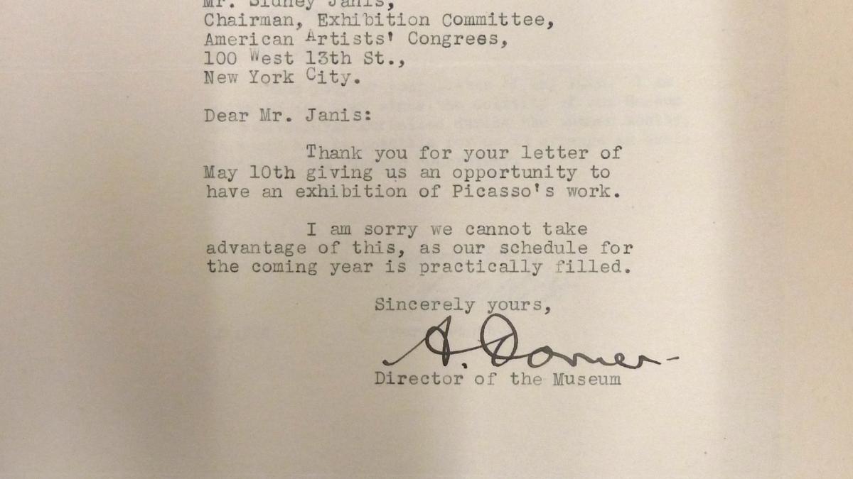 El director del Museum of Art Rhode Island, Alexander Dorner, escribe a Sidney Janis, director del Comité organizador de la exposición Picasso's Guernica para el Spanish Refugee Relief Campaign, rechazando la exposición por cuestiones de fechas.