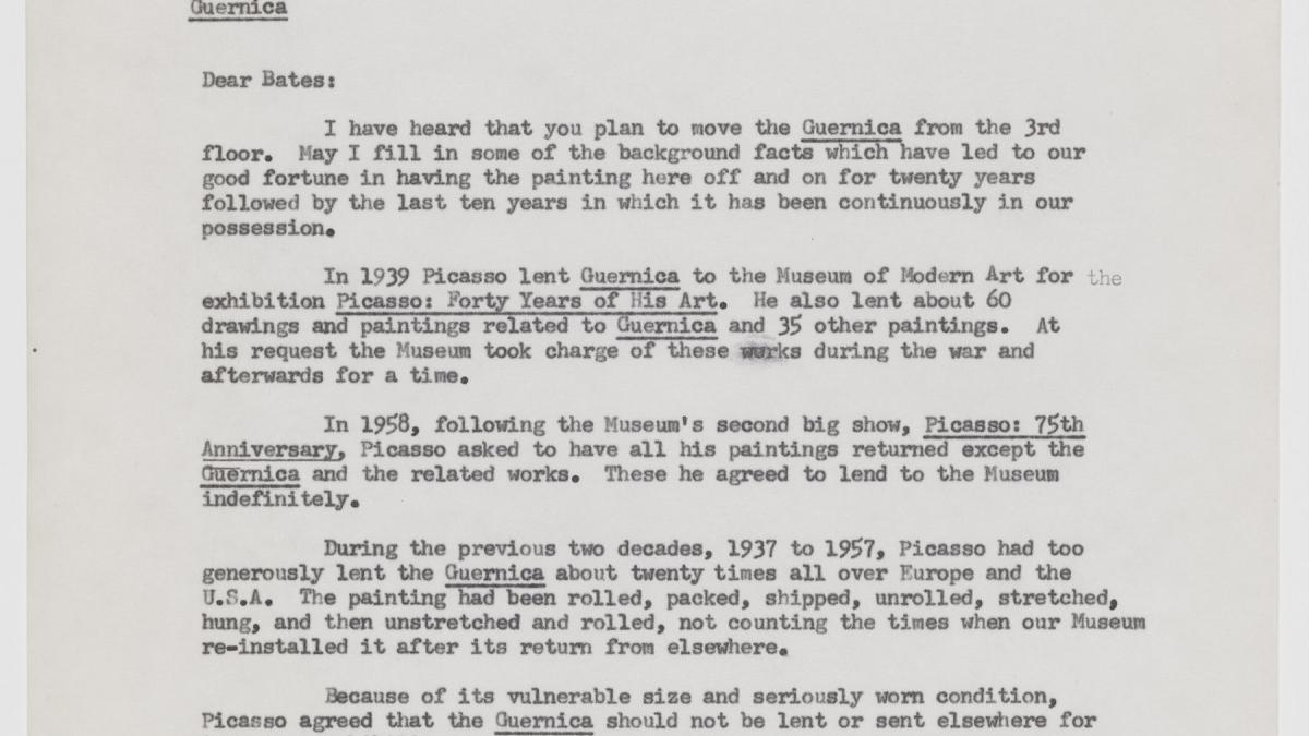 Alfred H. Barr Jr., director emérito del Departamento de Colecciones del Museum of Modern Art de Nueva York, escribe a Bates Lowry, director del museo, acerca de sus planes de cambiar de planta Guernica.