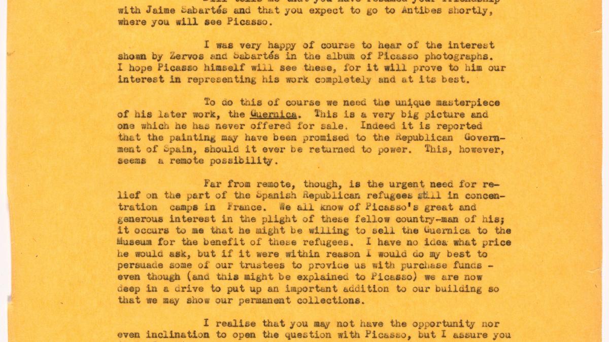 Carta de Alfred H. Barr Jr., director del Departamento de Colecciones del Museum of Modern Art de Nueva York, acerca de la posibilidad de que el museo compre Guernica y la venta se destine a los refugiados españoles que permanecen en campos de concentración de Francia.