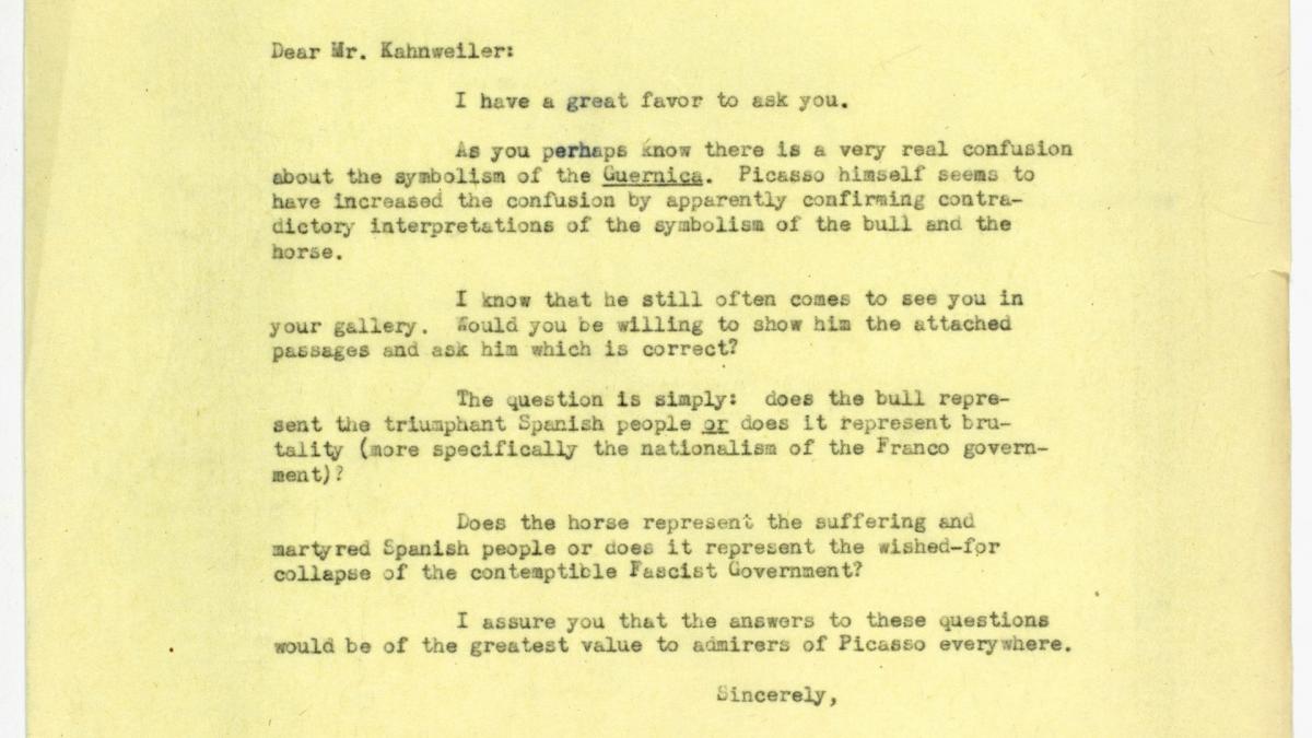 Alfred H. Barr Jr., director del Departamento de Colecciones del Museum of Modern Art de Nueva York, pide a Daniel-Henry Kahnweiler que aclare el simbolismo del toro y el caballo.