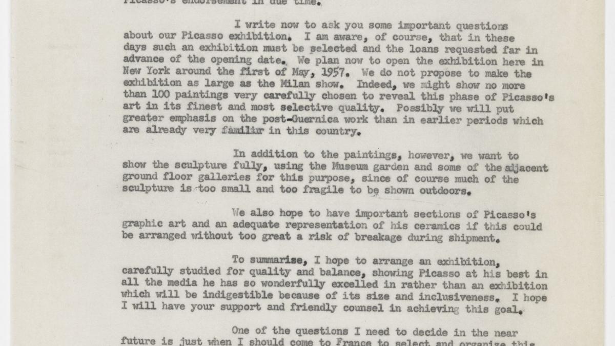 Alfred H. Barr Jr., director del Departamento de Colecciones del Museum of Modern Art de Nueva York, pregunta a Daniel-Henry Kahnweiler cuándo es más conveniente que viaje a Francia por cuestiones relacionadas con la exposición que prepara para 1957. También le transmite otras dudas, como qué le parece a Pablo Picasso el proyecto de la exposición o si sería posible traer obras de la URSS.