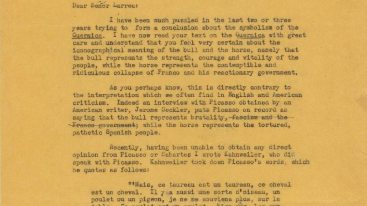 Alfred H. Barr Jr., director del Departamento de Colecciones del Museum of Modern Art de Nueva York, expone a Juan Larrea algunas cuestiones sobre la simbología e interpretación de Guernica, así como las declaraciones de Pablo Picasso y Daniel-Henry Kahnweiler al respecto.