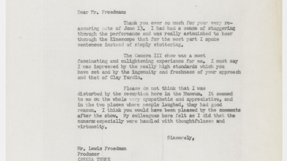 Alfred H. Barr Jr., director del Departamento de Colecciones del Museum of Modern Art de Nueva York, escribe a Lewis Freedman, productor de Camera Three, acerca del programa.