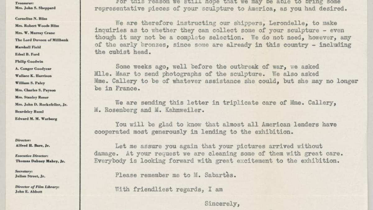 Alfred H. Barr Jr., director del Museum of Modern Art de Nueva York, informa a Pablo Picasso de las esculturas que le gustaría exponer y le asegura que sus obras llegaron en buen estado.