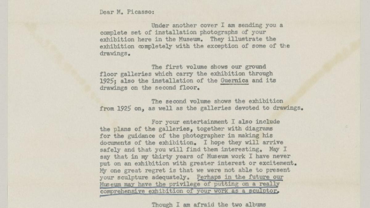 Alfred H. Barr Jr., director del Departamento de Colecciones del Museum of Modern Art de Nueva York, envía a Pablo Picasso fotografías de la exposición Picasso: 75th Anniversary y manifiesta sus deseos de realizar una exposición de su trabajo escultórico en el futuro.
