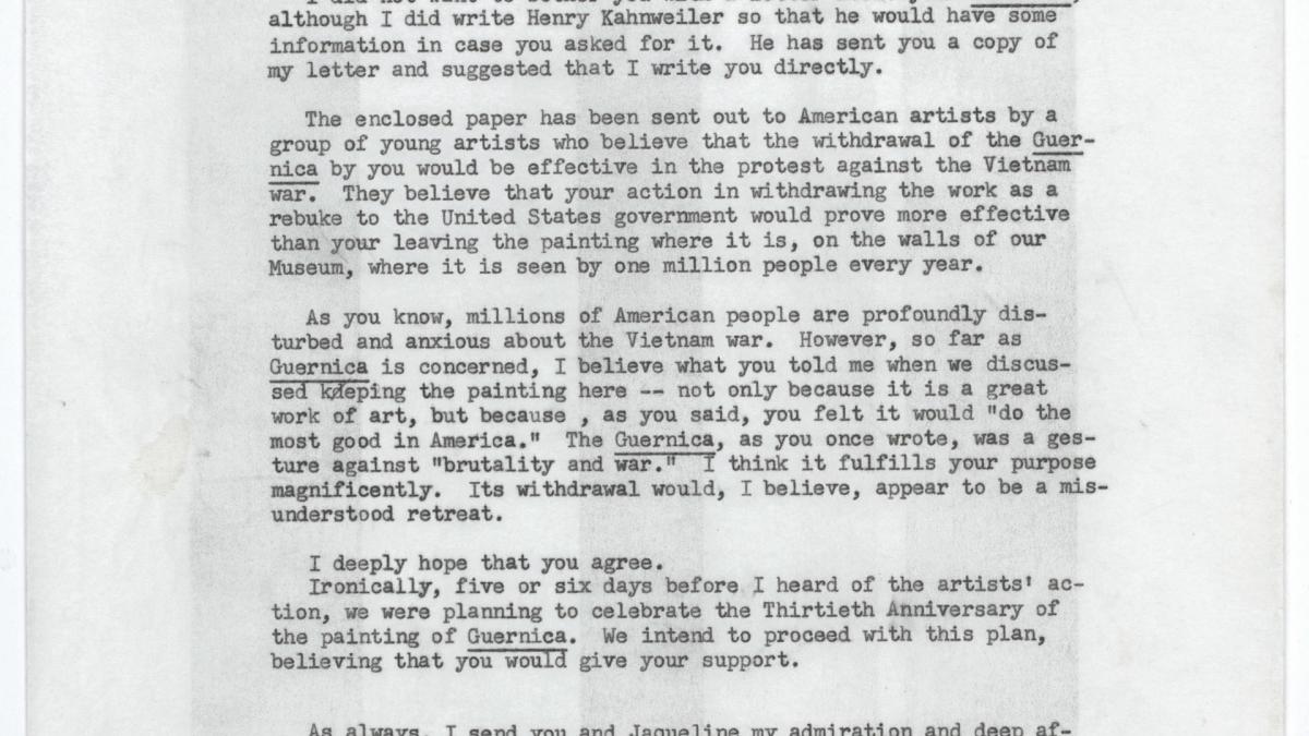 Alfred H. Barr Jr., director del Departamento de Colecciones del Museum of Modern Art de Nueva York, escribe a Pablo Picasso para comentarle la petición de retirada de Guernica del museo organizada por un colectivo de artistas como protesta contra la guerra de Vietnam.
