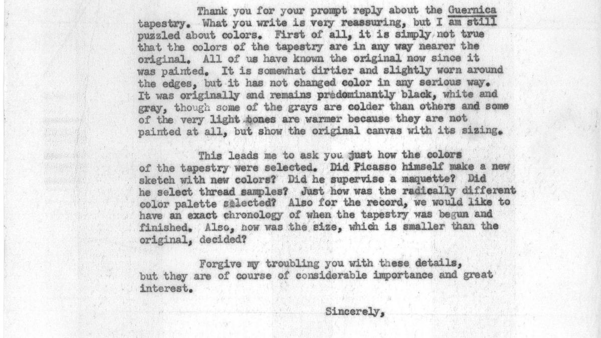 Alfred H. Barr Jr., director del Departamento de Colecciones del Museum of Modern Art de Nueva York, habla sobre los colores de la réplica de Guernica en tapiz y niega que se parezcan más al original que el propio cuadro, que según él no ha cambiado, y le pregunta cómo eligió los colores.