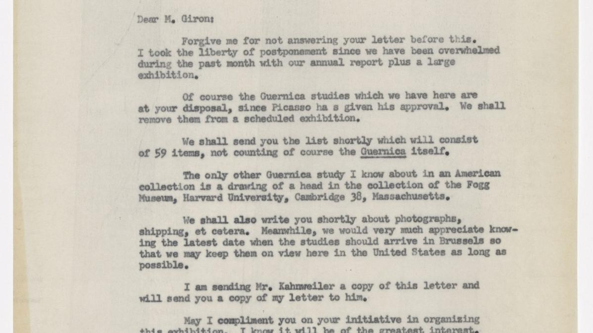 Alfred H. Barr Jr., director del Departamento de Colecciones del Museum of Modern Art de Nueva York, informa a Robert Giron, director del Palais des Beaux-Arts de Bruselas, de que se le enviará una lista de las obras relacionadas con Guernica para la exposición de Bruselas.
