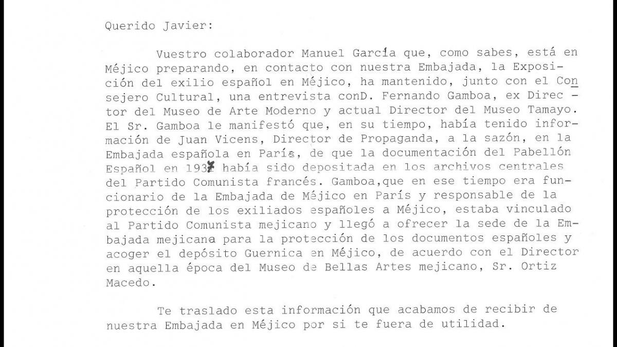 Álvaro González de Mesa, director general de Relaciones Culturales del Ministerio de Asuntos Exteriores, escribe a Javier Tusell, director general de Bellas Artes, acerca de la documentación del Pabellón Español de 1937 relativa a Guernica.