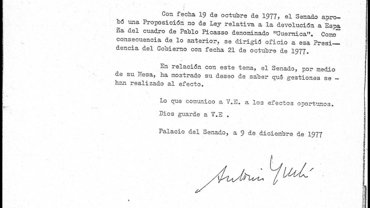 Antonio Fontán Pérez, presidente del Senado, escribe a Adolfo Suárez, presidente del Gobierno, acerca de las gestiones necesarias para reclamar Guernica una vez aceptada la petición.