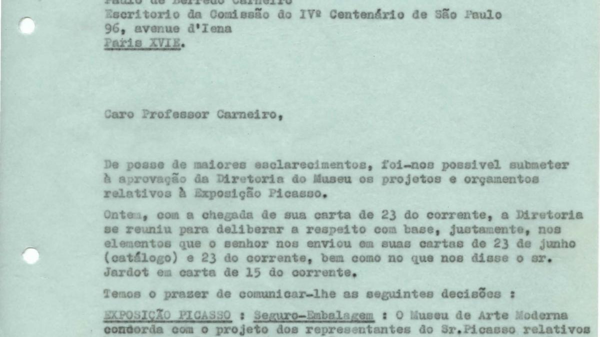 Arturo Profili, secretario de la II Bienal de São Paulo, comunica a Paulo E. de Berrêdo Carneiro, delegado para Europa del certamen, las decisiones tomadas por la Dirección del Museu de Arte Moderna de São Paulo relativas al proyecto y los presupuestos de la exposición de Pablo Picasso.
