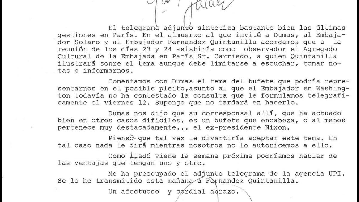 Carlos Robles Piquer, secretario de Estado del Ministerio de Asuntos Exteriores, escribe a Javier Tusell, director general de Bellas Artes, sobre la situación y reuniones con Roland Dumas y Rafael Fernández Quintanilla. Adjunta telegrama de Rafael Fernández Quintanilla sobre las conversaciones con el Museum of Modern Art de Nueva York y sus abogados.