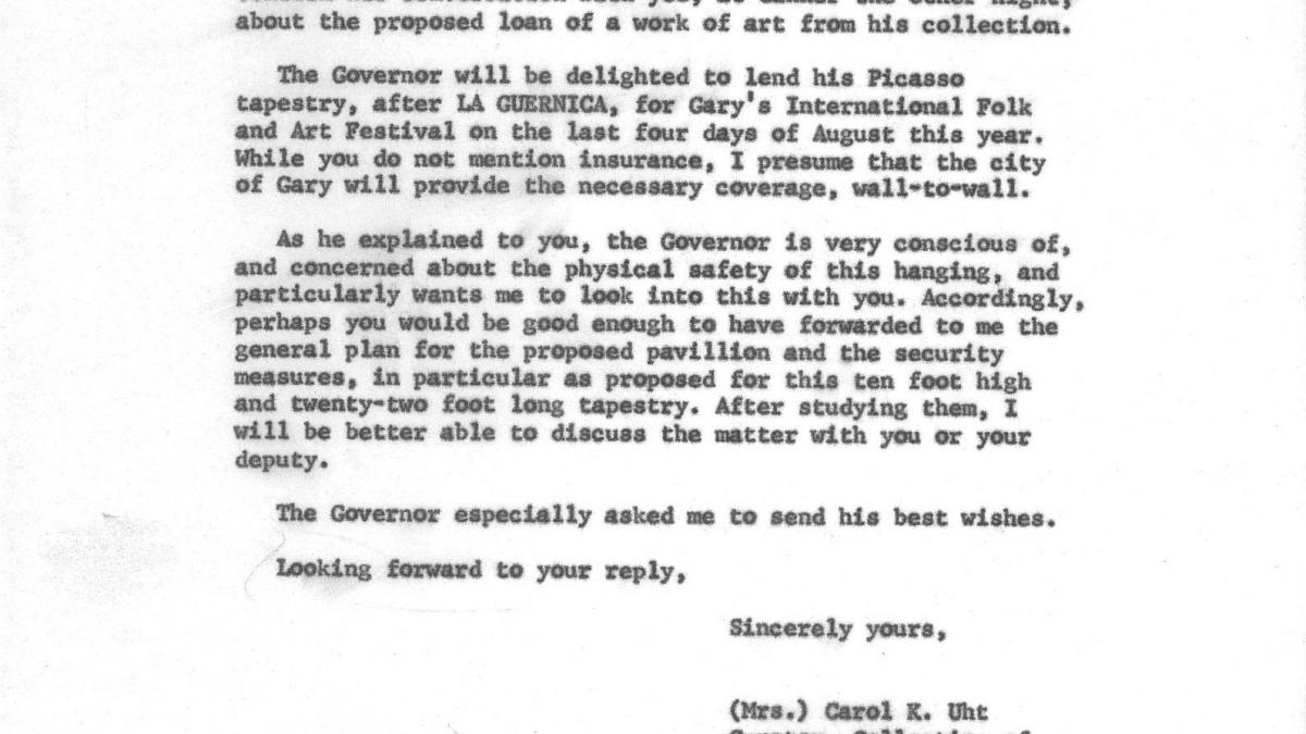 Carol K. Uht, conservadora de la colección de Nelson Rockefeller, confirma a Richard Gordon Hatcher, alcalde de Gary (Indiana), el préstamo de la réplica de Guernica en tapiz para el International Folk and Art Festival de la ciudad y le pregunta por los seguros.