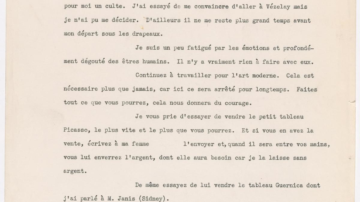 Christian Zervos escribe a Alfred H. Barr Jr., director del Museum of Modern Art de Nueva York, acerca de París y la guerra. Le pide que trate de vender Guernica y otro cuadro de Picasso.