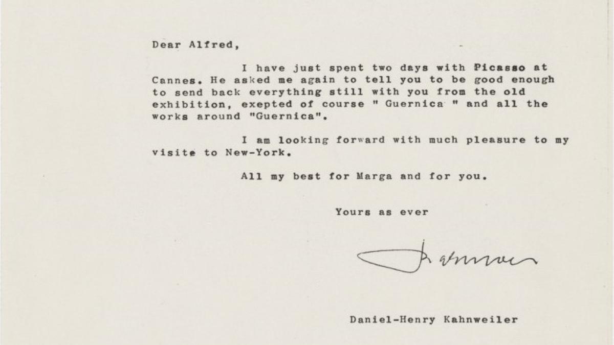 Daniel-Henry Kahnweiler comunica a Alfred H. Barr Jr., director del Departamento de Colecciones del Museum of Modern Art de Nueva York, que Pablo Picasso quiere que le devuelva todas las obras prestadas para la exposición Picasso: 75th anniversary salvo Guernica.