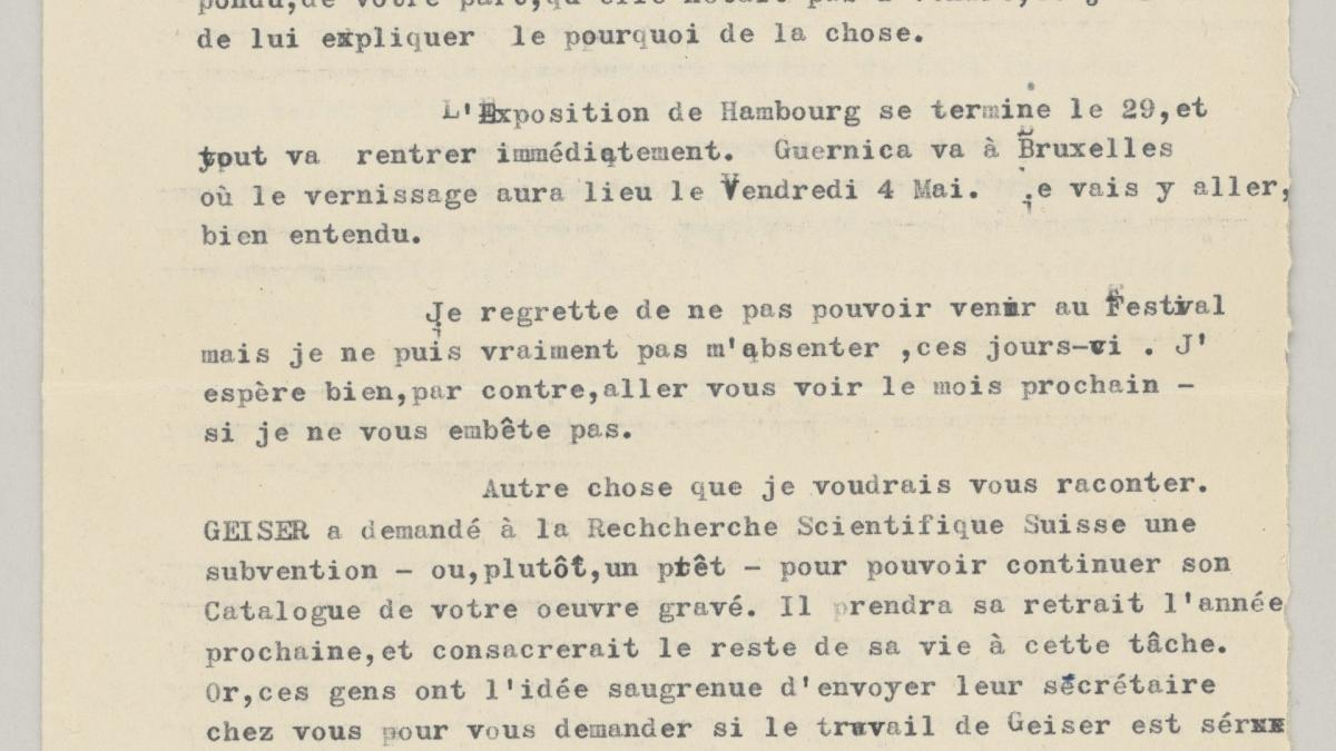 Daniel-Henry Kahnweiler informa a Pablo Picasso sobre el traslado de Guernica de Múnich a Bruselas y otras cuestiones como las fotografías para el libro de Bernhard Geiser.