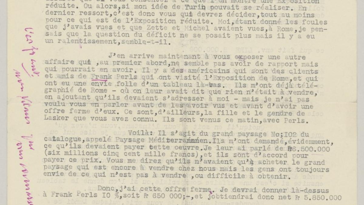 Daniel-Henry Kahnweiler reenvía a Pablo Picasso la carta de Eugenio Reale, senador del Partido Comunista Italiano y miembro del comité organizador de las exposiciones de Roma y Milán, del 2 junio sobre los problemas de realizar la exposición en Milán e incluye la información y los presupuestos de las posibles soluciones.