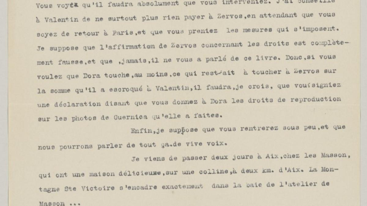 Daniel-Henry Kahnweiler envía a Pablo Picasso una carta de Christian Zervos acerca de los derechos de fotografías que no pertenecen a Dora Maar y en la que le pide que intervenga.