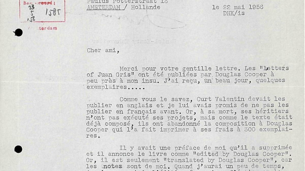 Daniel-Henry Kahnweiler escribe a Willem Sandberg, director del Stedelijk Museum, sobre la edición de Letters of Juan Gris y acepta la invitación de ir a Ámsterdam a dar una conferencia.