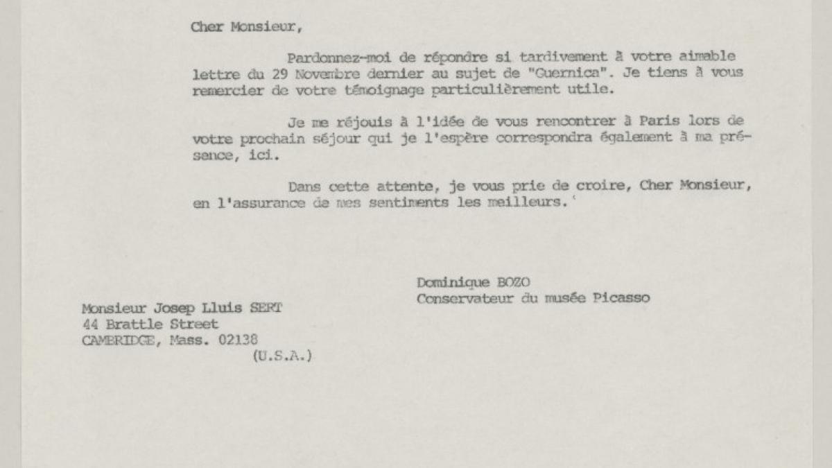 Dominique Bozo, director del Musée Picasso de París, agradece a Josep Lluís Sert su carta del 29 de noviembre sobre Guernica.