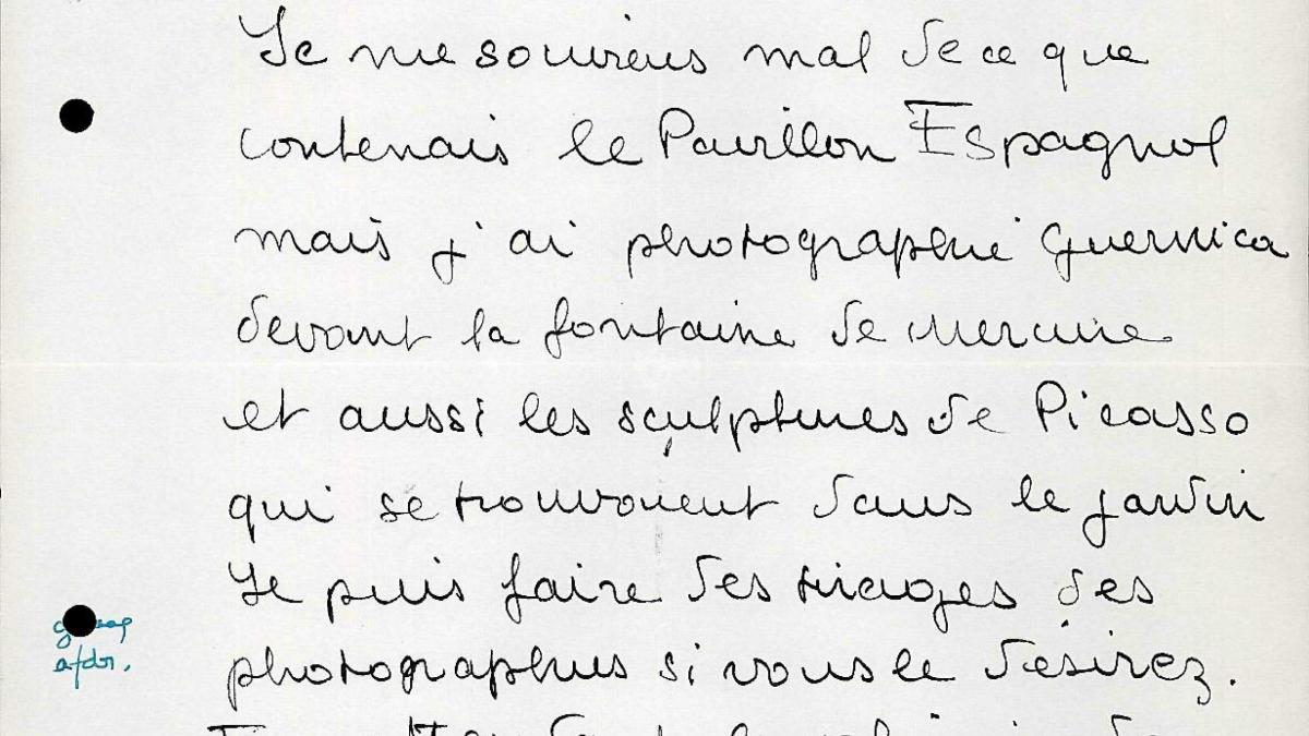 La fotógrafa Dora Maar confirma a Willem Sandberg, director del Stedelijk Museum de Ámsterdam, que no recuerda lo que había en el Pabellón de España, pero que realizó fotos de Guernica ante la Fuente de Mercurio de Alexander Calder, así como de las esculturas de Pablo Picasso que se encontraban en el jardín.