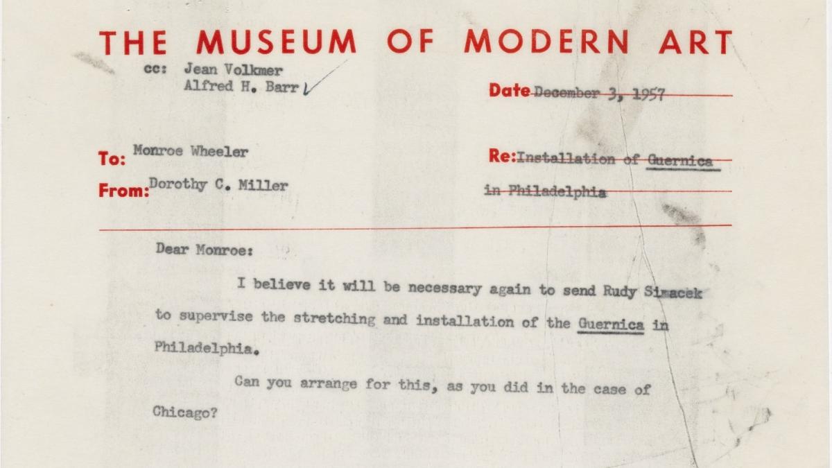 Dorothy C. Miller, conservadora  del Museum of Modern Art de Nueva York, solicita a Monroe Wheeler, director de Exposiciones y Publicaciones, que Rudy Simacek, maestro carpintero del museo, supervise la instalación de Guernica en Filadelfia para la exposición Picasso: 75th Anniversary.