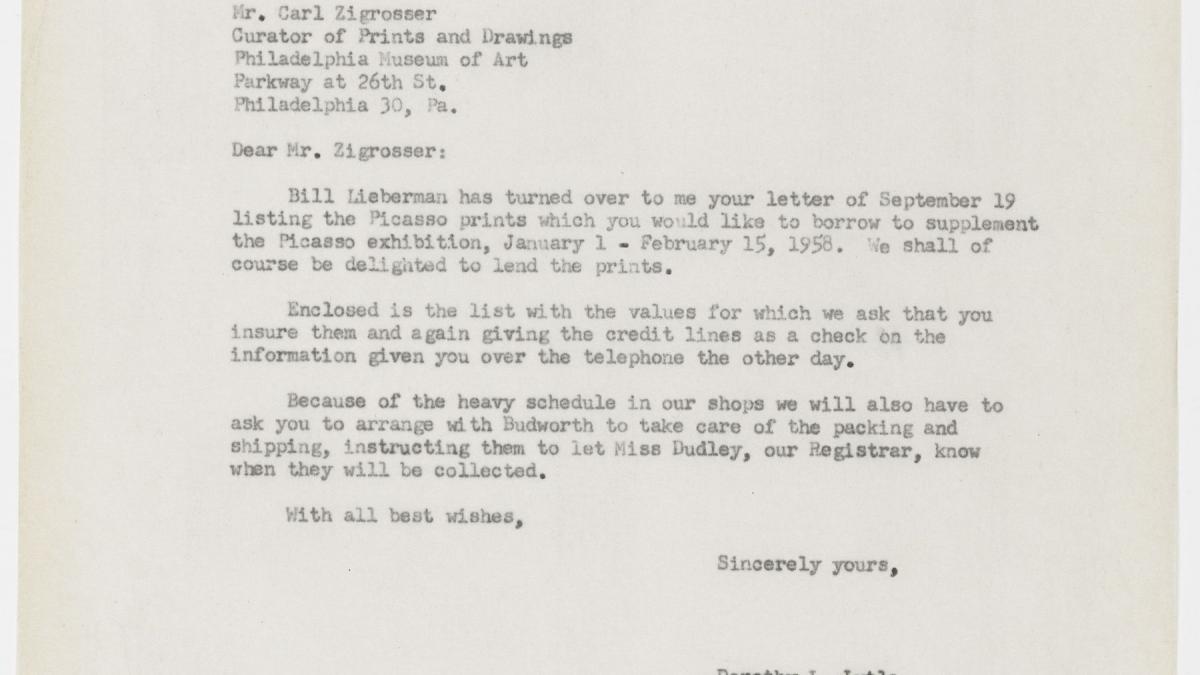 Dorothy L. Lytle envía una carta a Carl Zigrosser, conservador de grabados y dibujos del Philadelphia Museum of Art, en relación con el préstamo de grabados para complementar la exposición de Picasso, del 1 de enero al 15 de febrero de 1958.
