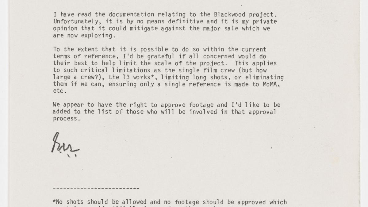 Eleanor L. Saxe, del Museum of Modern Art de Nueva York, se dirige a varios miembros del museo acerca del proyecto de Blackwood, y aconseja hacer un proyecto más modesto y de menor duración.