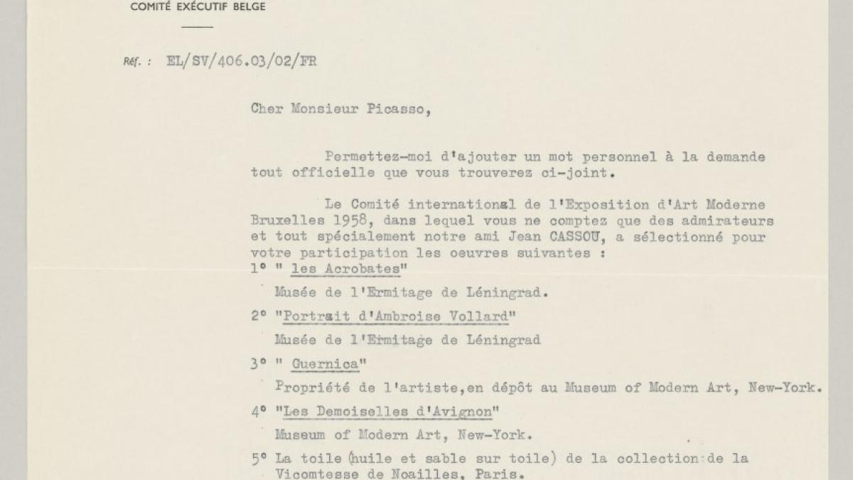 Émile Langui, director general de las Artes y las Letras del Ministerio de Educación de Bélgica, envía a Pablo Picasso la relación de obras que quieren exponer en la Exposición Internacional de Bruselas de 1958, entre las que se encuentra Guernica.