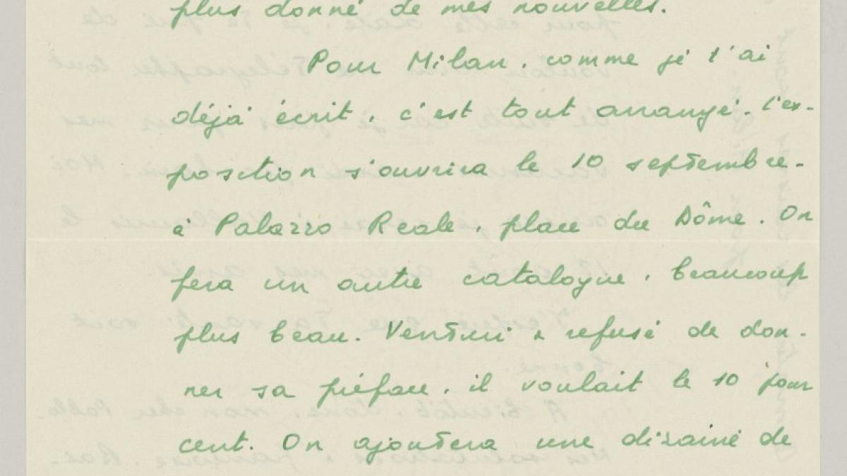 Eugenio Reale, senador del Partido Comunista Italiano y miembro del comité organizador de las exposiciones de Roma y Milán, comunica a Pablo Picasso que todo está listo para la exposición de Milán y el catálogo, así como para el rodaje de la película de Luciano Emmer.