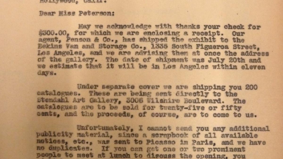 Evelyn Ahrend, directora de la Oficina de Programas de la Spanish Refugee Relief Campaign, informa a Marcelene Peterson, secretaria ejecutiva del sindicato Motion Pictures Artists' Committee sobre el envío de la exposición, los catálogos y la imposibilidad de enviar material publicitario.