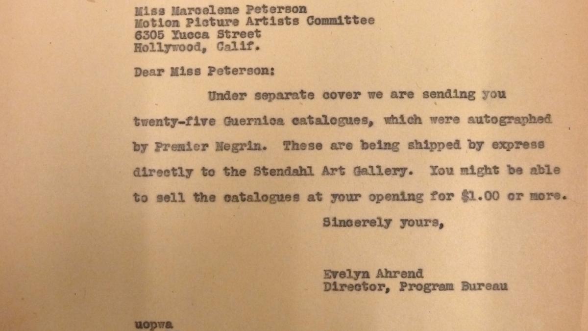 Evelyn Ahrend, directora de la Oficina de Programas de la Spanish Refugee Relief Campaign, informa a Marcelene Peterson, secretaria ejecutiva del sindicato Motion Pictures Artists' Committee, sobre el envío de catálogos.