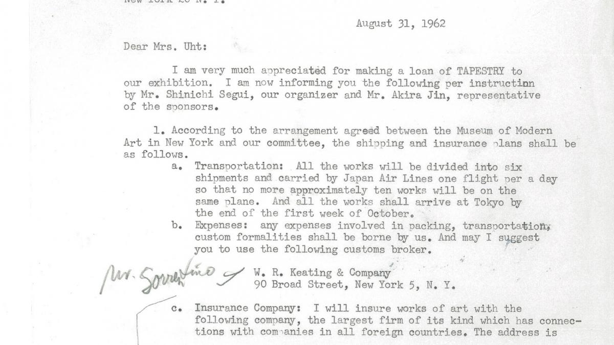 Hiromitsu Kihara, director del Departamento de Promoción de la Art Friend Association de Japón, envía a Carol K. Uht, conservadora de la colección de Nelson Rockefeller, detalles del transporte de la réplica de Guernica en tapiz, los seguros y los datos de los contactos en Tokio y Nueva York.