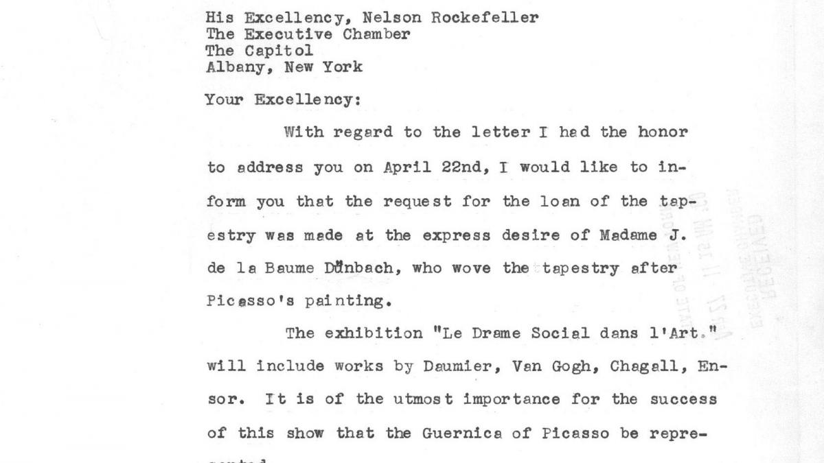 Jan-Albert Goris, ministro plenipotenciario y comisario de Información de Bélgica, sobre el préstamo de la réplica de Guernica en tapiz para la exposición Le drame social dans l'art del Palais des Beaux-Arts de Bruselas.