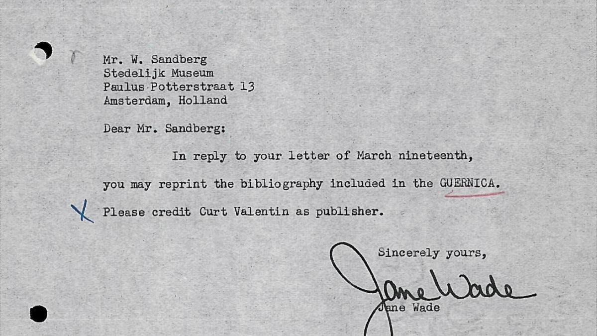 Jane Wade, secretaria de Curt Valentin, da permiso a Willem Sandberg, director del Stedelijk Museum, para reimprimir la bibliografía del libro de Larrea.