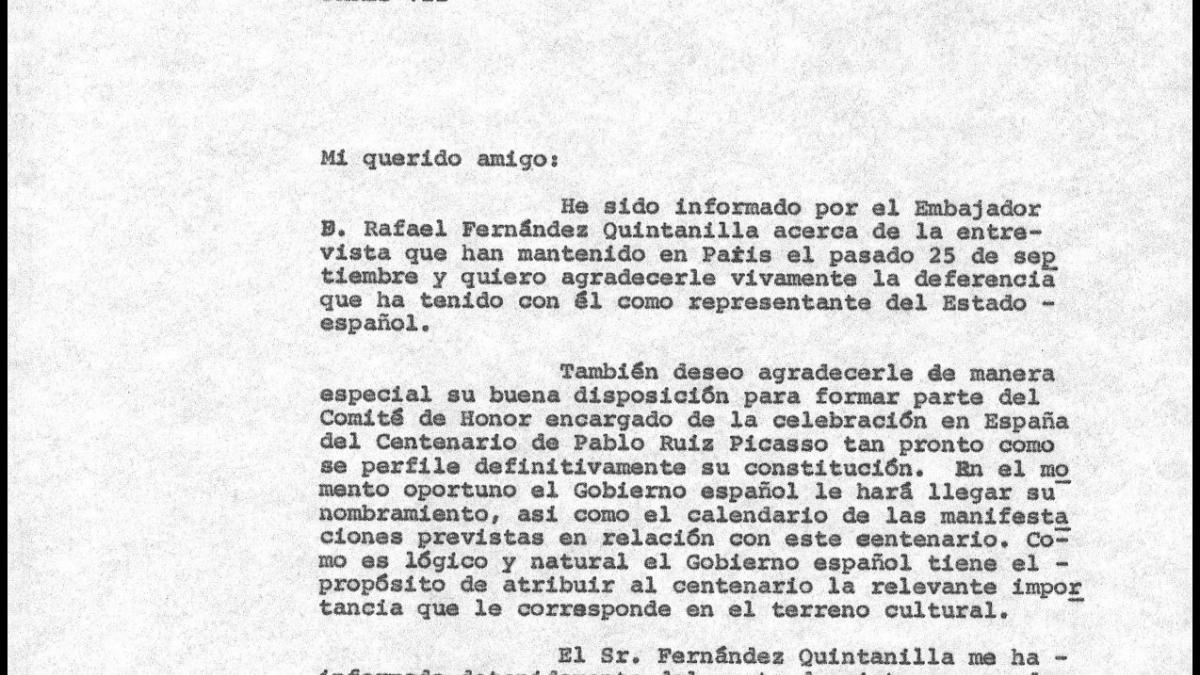 Javier Tusell, director general de Bellas Artes, escribe a Bernard Ruiz-Picasso, hijo del pintor, con cuestiones sobre la instalación de Guernica en el Casón del Buen Retiro. Reitera su agradecimiento por la disposición en el proceso de negociación y traslado del cuadro, así como haber aceptado formar parte del Comité de Honor del Centenario de Picasso.