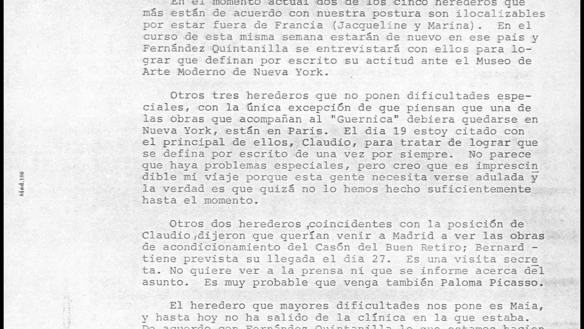 Javier Tusell, director general de Bellas Artes, comunica a Íñigo Cavero, ministro de Cultura, las últimas actuaciones en la negociación con los herederos de Pablo Picasso.