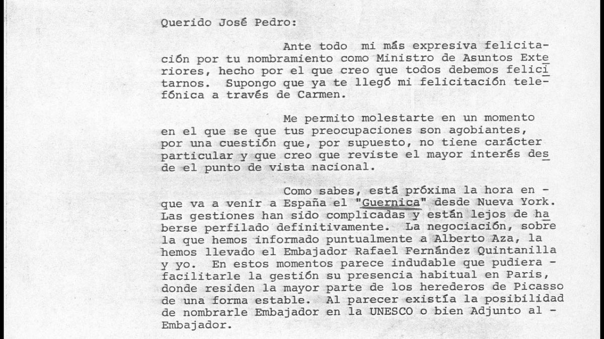Javier Tusell, director general de Patrimonio Artístico, Archivos y Museos del Ministerio de Cultura, escribe a José Pedro Pérez-Llorca, recién nombrado ministro de Asuntos Exteriores, para que medie en las negociaciones con los herederos de Pablo Picasso.