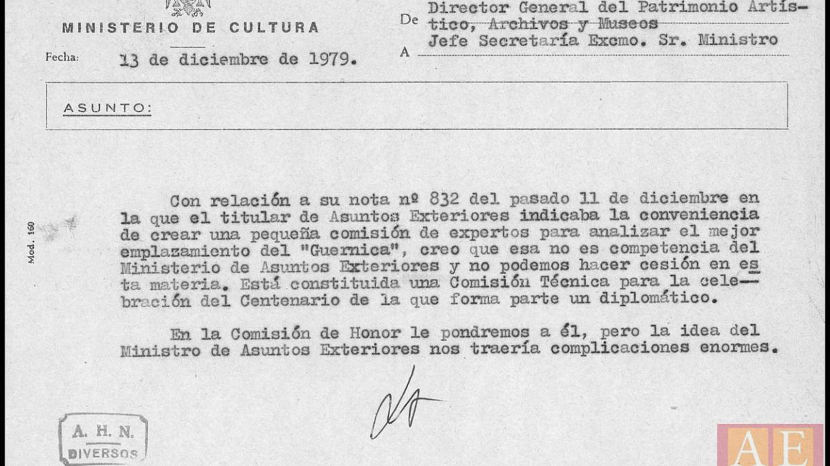 Marcelino Oreja, Ministro de Asuntos Exteriores, desaconseja a Javier Tusell, director general de Patrimonio Artístico, Archivos y Museos del Ministerio de Cultura, la creación de un comité de expertos, que no considera competencia del Ministerio de Asuntos Exteriores.