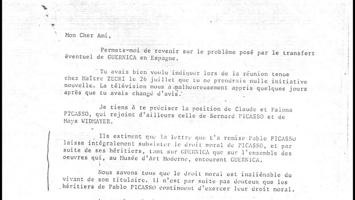 El abogado Jean-Denis Bredin escribe a Roland Dumas, abogado testamentario de Pablo Picasso, sobre los derechos morales de los herederos de Picasso sobre Guernica.