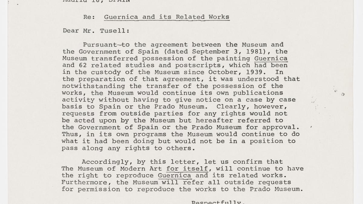 John Koegel, asesor general y secretario del departamento jurídico del Museum of Modern Art de Nueva York, escribe a Javier Tusell, director general de Bellas Artes, acerca del acuerdo establecido por el que, aunque hayan entregado Guernica y los 62 estudios, el MoMA continuará sus actividades editoriales utilizando imágenes de esas obras sin tener que informar al Museo del Prado, pero no pudiendo dar el permiso de uso a terceras partes.